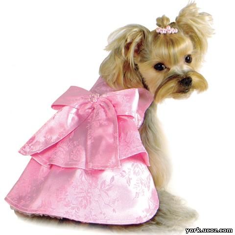 Уникальную длинную шерсть йорка непросто сохранить в выставочной кондиции. Как и красивые женские волосы, она требует бережного ухода. И тут на помощь приходят комбинезоны и попонки, выполняющие защитную функцию, поскольку длинная шерсть выставочных йорков нуждается в практичной защитной одежде, предотвращающей спутывание и загрязнение промасленной и убранной в папильотки шерсти. Очень часто выставочные йорки не гуляют, так как любой контакт с окружающей средой может негативно отразиться на шерсти. Трава может вызвать сечение волос, грязь, пыль и тополиный пух – спутанность и ломкость. Поэтому чтобы не лишать собак удовольствия от прогулок, необходимо правильно подобрать их гардероб. В качестве повседневной уличной одежды используются шелковые комбинезоны, для холодной погоды непромокаемые комбинезоны из болоньи с утеплителем из синтепона. Но у одежды для йорика есть и другая функция – декоративная, поскольку йорки часто выполняют роль живой куклы. Именно на владельцев йорков рассчитаны рекламные объявления такого содержания: «огромный выбор аксессуаров для собак – бантиков и стильных ошейников. Постоянное обновление одежды, эксклюзивная коллекция свитеров и попон для «выхода в свет» с вашим питомцем. В любое время года, в любую погоду ваша собака будет одета модно и удобно для вас и для нее». Специально для йорков модные модельеры шьют новые коллекции одежды к каждому сезону. Фантазия владельцев при выборе одежды для йоркширов не ограничена ничем! Более того, владельцы этих крошек абсолютно уверены, что, одевая своих собачек, они просто потакают их желаниям, и что собачки целиком разделяют любовь своих элегантных хозяев к красивой одежде. Даже дома йорики часто «щеголяют» в шелковистых халатиках-комбинезонах, а на прогулку на их нередко надевают теплые пальто и даже шубы. А уж по подиуму эти кроши ходят в свадебных платьицах или фраках, мантиях и кружевах. Проводились даже показы нижнего белья специально для йорков, где по желанию своих владельцев малыши демонстрировали кружевные боди с подвязками. Хозяева говорят, что наряжать малюток для них – одно удовольствие, бантики и рюшечки на них вполне уместны. Тогда как представить себе стокилограммового мастифа с розовым бантиком на загривке или овчарку в юбочке можно только в фантастическом сне. А вот йоркшир с радостью выполнит все причуды владельца, да еще даст себе челочку подкрасить, духами побрызгать (специальными собачьими духами, с оттенками ароматов розового дерева, листьев апельсина, фрезии, сандала и ванили) и коготки лаком покрасить. Специально для йоркширских терьеров (а вернее для их богатых владельцев) известные ювелирные дома разрабатывают модели заколок, например, в форме бабочки, или в виде косточки из белого золота, украшенные бриллиантами. Есть в продаже и ошейники из черной кожи с россыпью цирконов и бриллиантов – для светло окрашенных или стриженых йоркширов, а также розовые из кожи питона с инкрустацией в форме бабочки для темных йорков. Ошейники из кожи крокодила с бриллиантовой надписью «CROKODILE» привлекут владельцев, ориентированных на классический стиль. Специально для владельцев йоркширских терьеров проводятся специализированные «Йорки-Шоу», в рамках которых проходят показы «собачьей» высокой моды, конкурсы собачьего маникюра, г